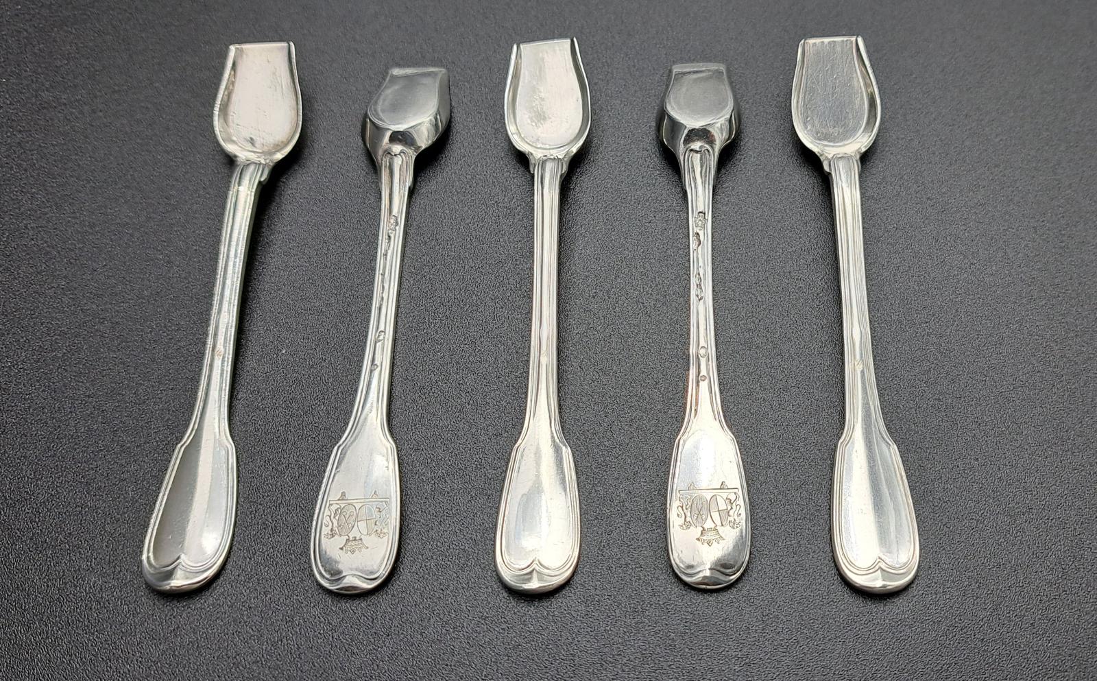 Au XVIIIe siècle, l’introduction de la cuillère à sel coïncide avec le déclin de cette salière monumentale, remplacée par plusieurs salières de petit format, chacune dotée de sa propre cuillère. Ces dernières, longues de 7 à 11 cm, adoptent des formes variées - cuilleron ovale, coquille, pelle. Elles sont le plus souvent réalisées en argent, un métal pourtant sensible à l’action corrosive du sel et de l’humidité. Plus rares, les modèles en vermeil, recouverts d’une fine couche d’or inaltérable, offrent une meilleure résistance à cette altération.